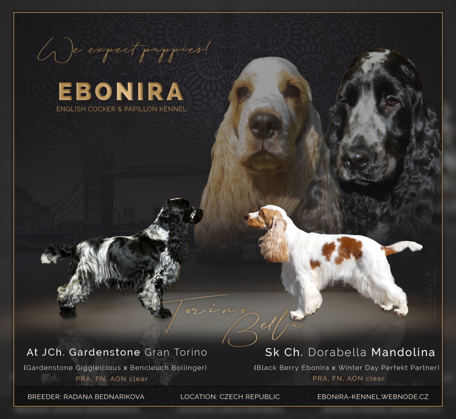 Oba rodiče jsou milí představitelé plemene s úspěchy ve výstavním kruhu. Těší nás jak skvělá miminka se po nich podařila, přestože při porodu jsme Bellu prosili hrnečku dost... Jejich potomci zdědí přátelskou povahu a příjemný temperament. U některých se baterky nikdy nevybijí :)